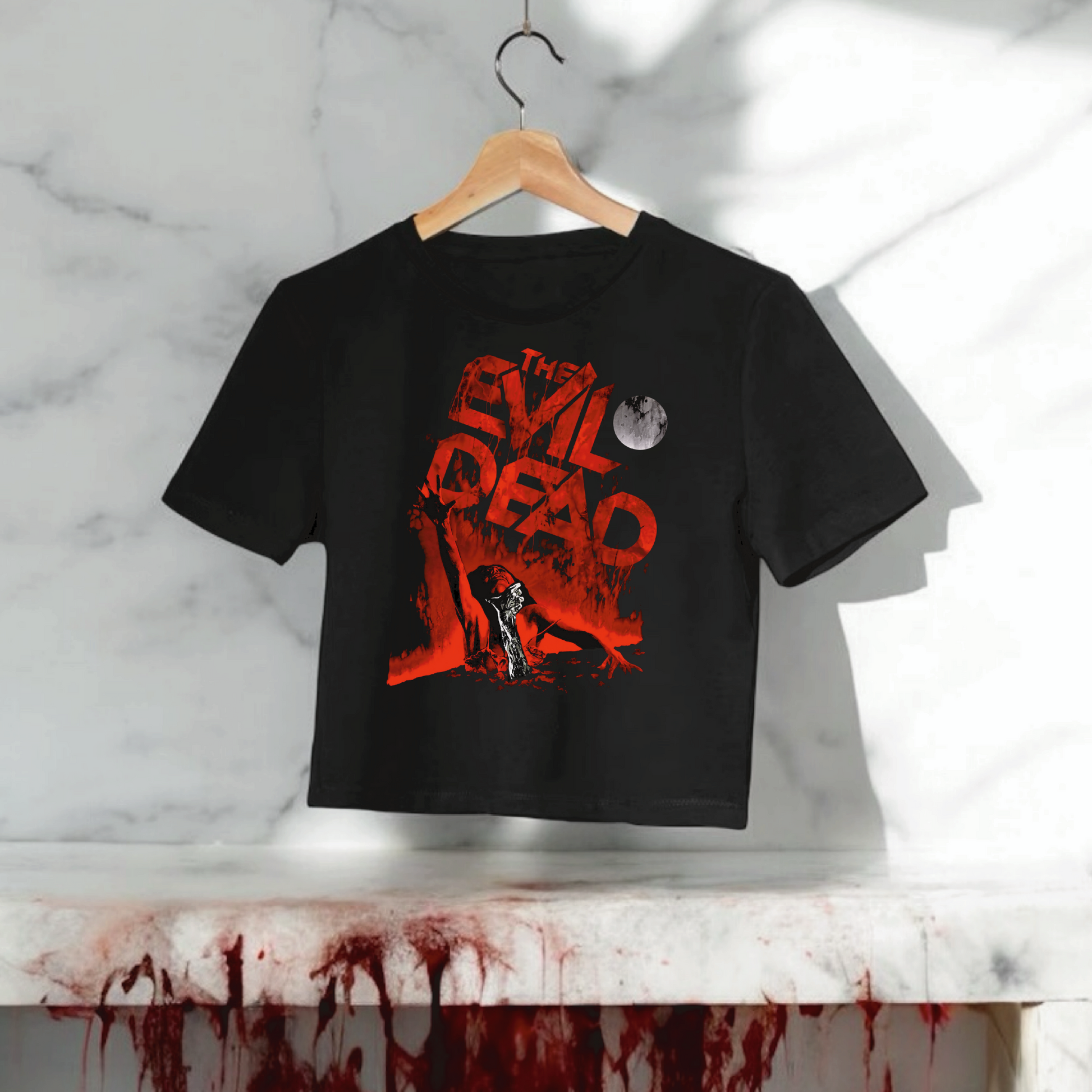 This Evil Dead crop top brings the blood, the book, and the badass energy of Ash Williams to your wardrobe. Featuring iconic imagery from the cult-classic horror film, it’s the perfect piece for fans who like their fashion as fierce as a chainsaw-wielding deadite slayer.
