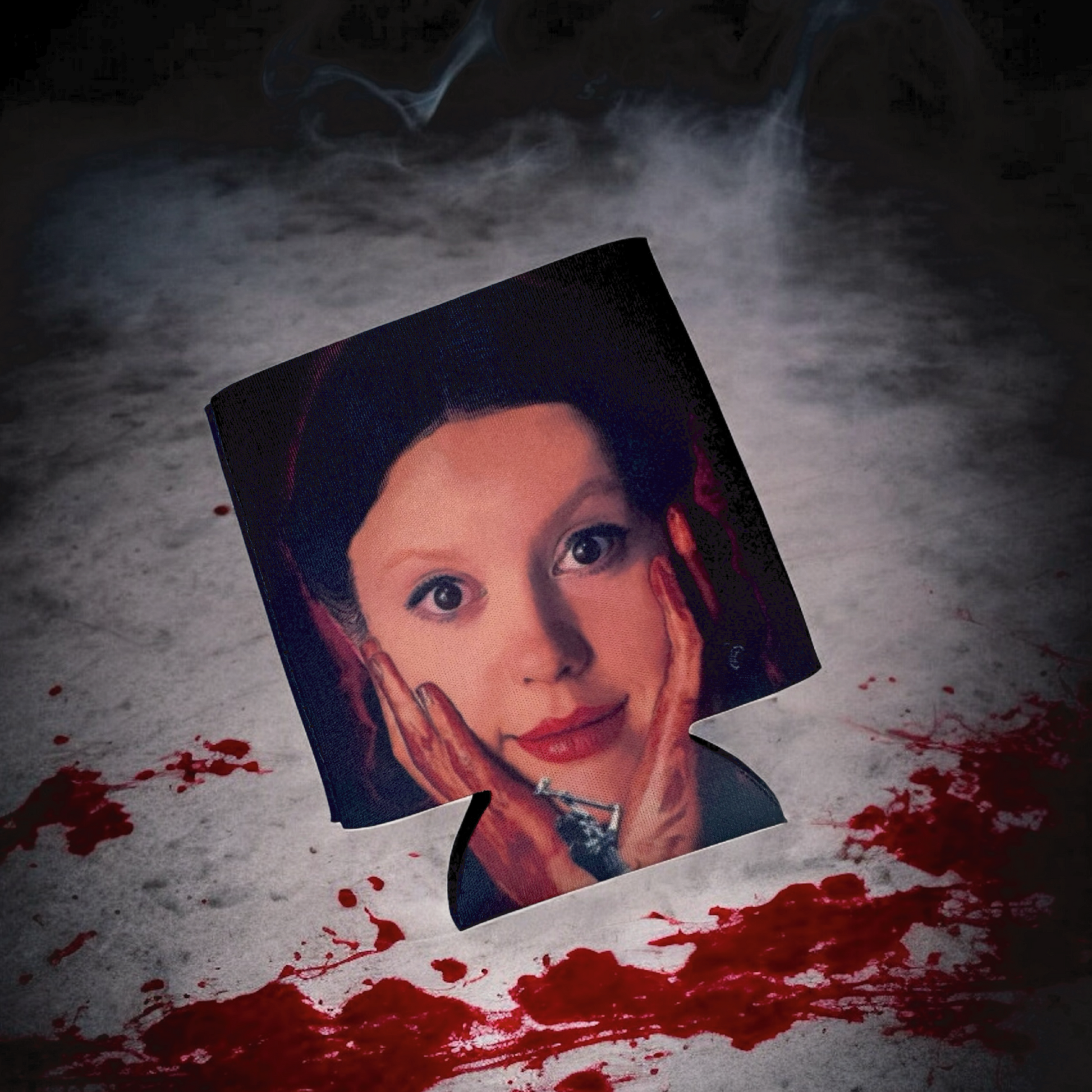 “I’m a star!” Keep your drink ice cold while your obsession with fame burns hot with the Pearl Koozie, inspired by Ti West’s Pearl. Featuring eerie, vintage-style artwork of horror’s favorite starlet-in-the-making, this koozie is the perfect blend of 1918 charm and blood-soaked ambition.