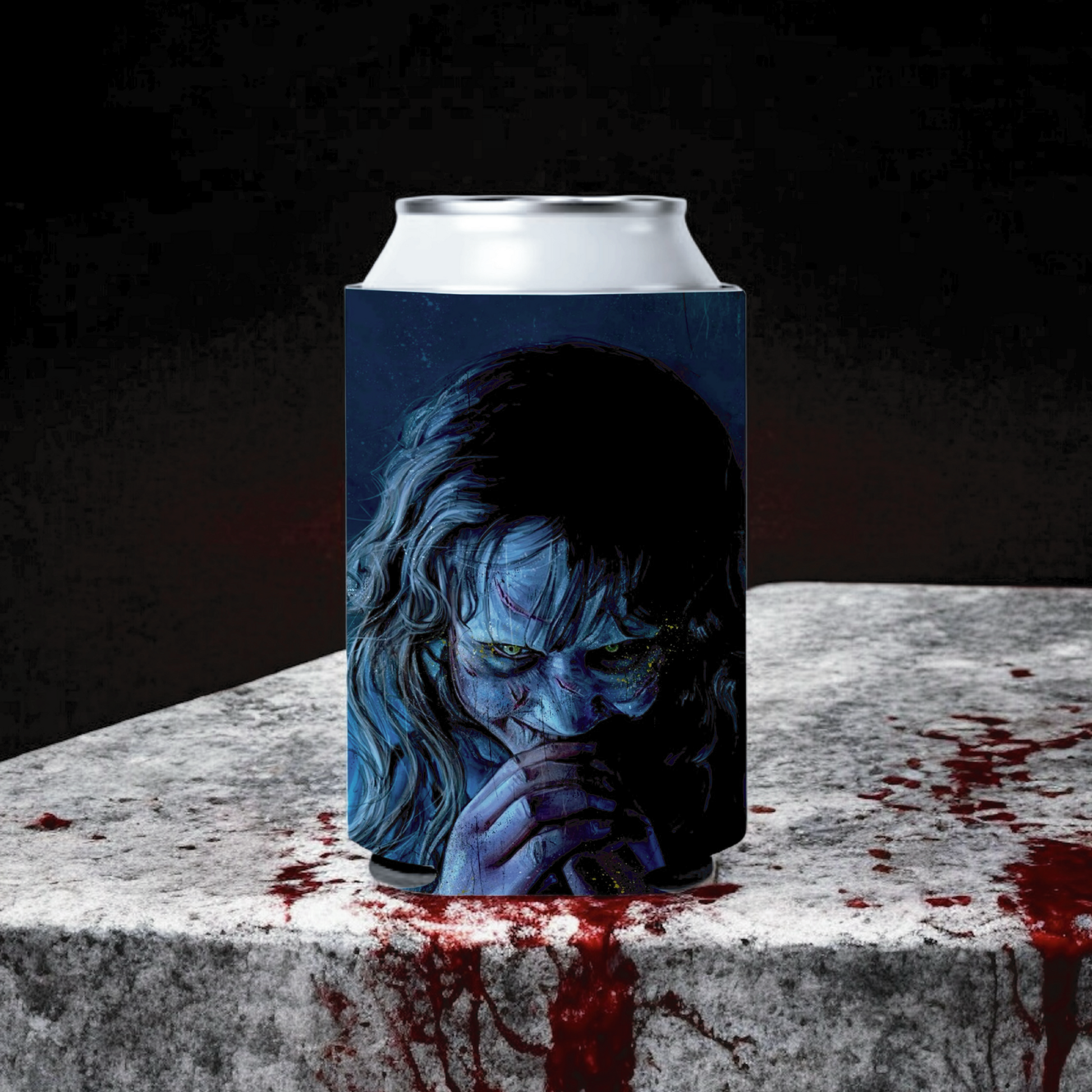 “What an excellent day for a cold drink.” Possess your beverage with the Regan Koozie, inspired by the most terrifying moments from The Exorcist. Featuring eerie artwork of Regan MacNeil in her most iconic, possessed state, this koozie is both functional and frightening — keeping your drink ice cold while giving everyone else the chills.
