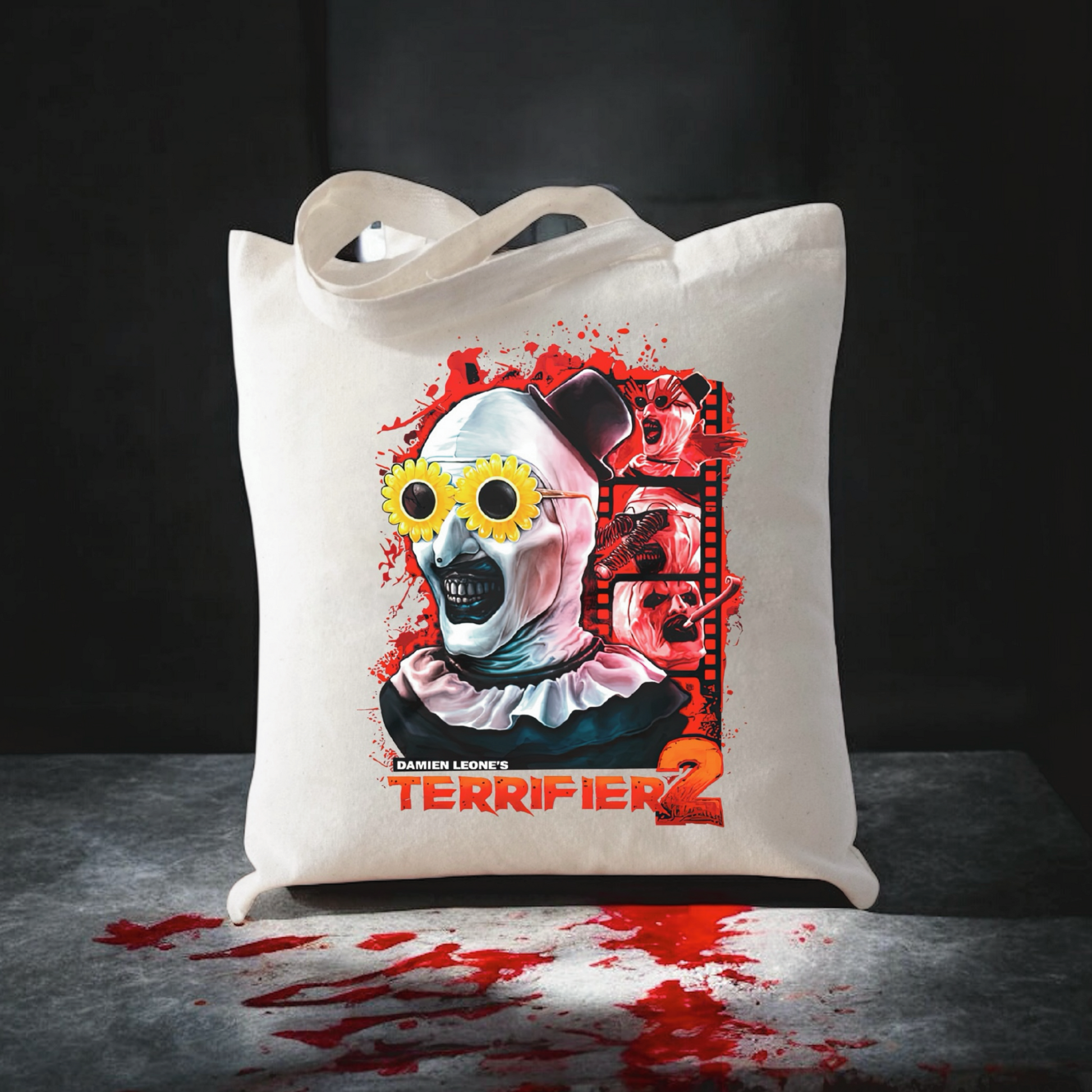 Take your love for horror on the go with the Terrifier 2 Tote Bag, featuring a chilling design inspired by the infamous Art the Clown from the Terrifier series. Perfect for horror fans who want to add a sinister touch to their everyday carry, this tote is as stylish as it is practical.